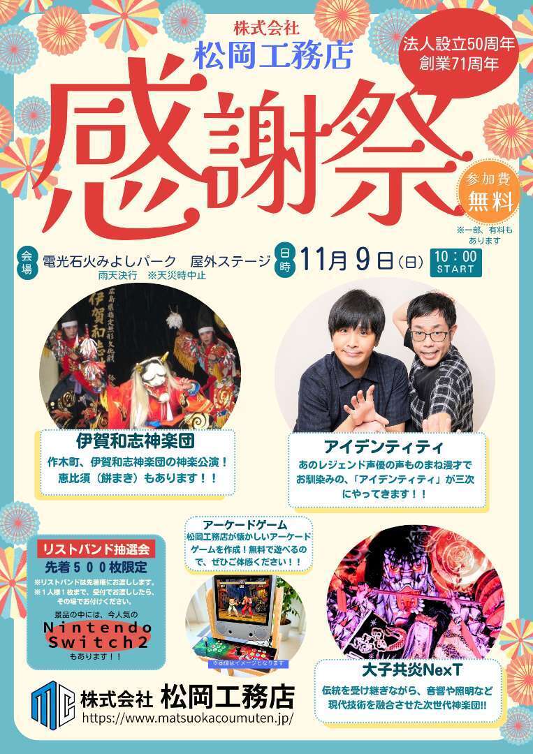 11月9日(日)の10時から(株)松岡工務店の感謝祭を電光石火みよしパークの屋外ステージで行います!コンビ芸人のアイデンティティさんのお笑いライブもあるので、楽しみに待っててください(*・ω・)*_ _))ペコリン